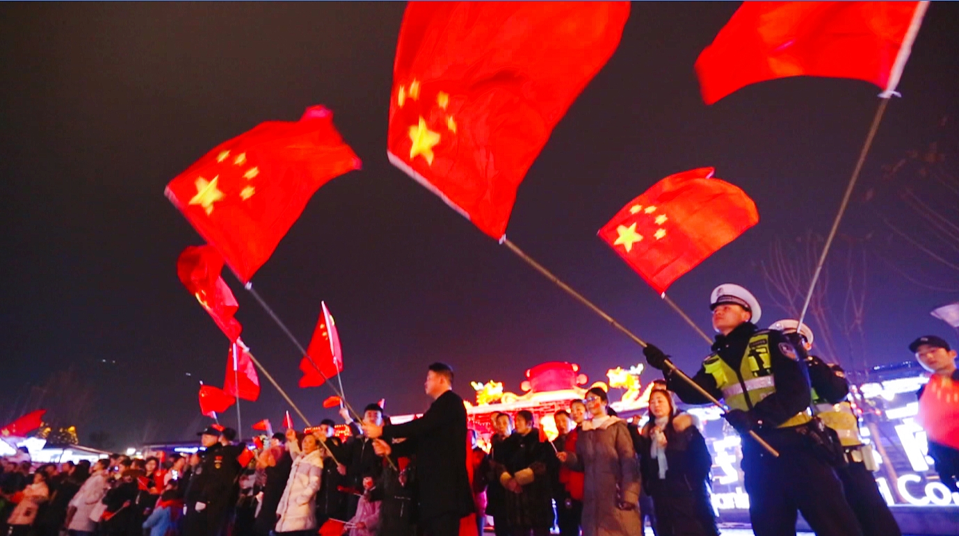 1月31日晚20:00,熊貓燈會(huì)華燈璀璨,人流熙熙攘攘?!拔逍羌t旗迎風(fēng)飄揚(yáng),勝利歌聲多么嘹亮……”清脆的童聲突然響徹夜空,讓所有人停下了腳步。音樂漸漸響起,人群中響起了唱合的聲音。越來越多的人走了出來,他們身上佩戴著紅色的圍巾,臉上畫著五星紅旗,手中拿著五星紅旗,一邊歌唱,一邊走向燈會(huì)的中心廣場。一百多名快閃表演者在中心廣場最具中國傳統(tǒng)特色的“盛世宮燈”前匯聚成矩陣,二十多只大熊貓胖墩兒也手持五星紅旗加入其中。“我愛你中國,心愛的母親,我為你流淚,也為你自豪……”載歌載舞的快閃表演,很快把園內(nèi)的觀燈群眾吸引了過來,隨著歌曲的高潮,全場五星紅旗都揮舞起來,人們高舉雙手,打著拍子,一起唱和,激情澎湃。