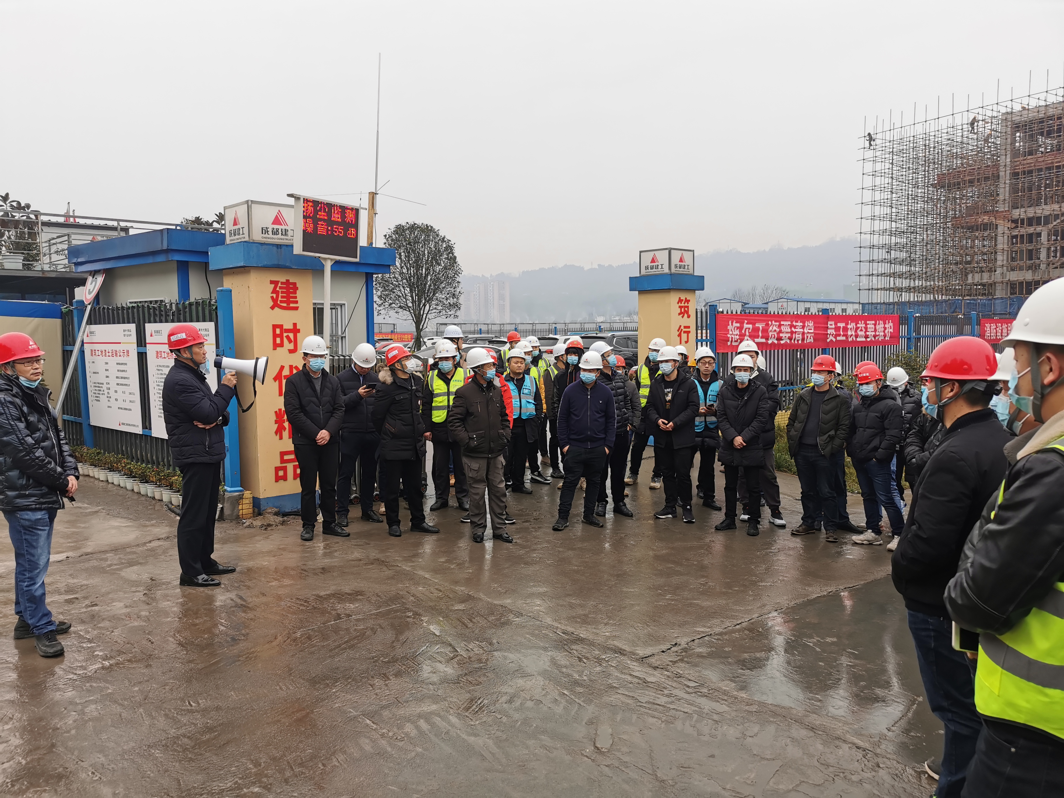 現(xiàn)場會上,成都建工雅安公司會展項(xiàng)目經(jīng)理向到場人員詳細(xì)介紹了項(xiàng)目基本情況,并就交流了項(xiàng)目現(xiàn)場安全文明施工、項(xiàng)目防疫防控、民工實(shí)名制管理及揚(yáng)塵治理方面的工作經(jīng)驗(yàn)。