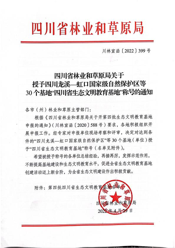 4月29日四川省林業(yè)和草原局發(fā)布第四批四川省生態(tài)文明教育基地名單,蒙頂山景區(qū)榮獲“四川省生態(tài)文明教育基地”稱號。