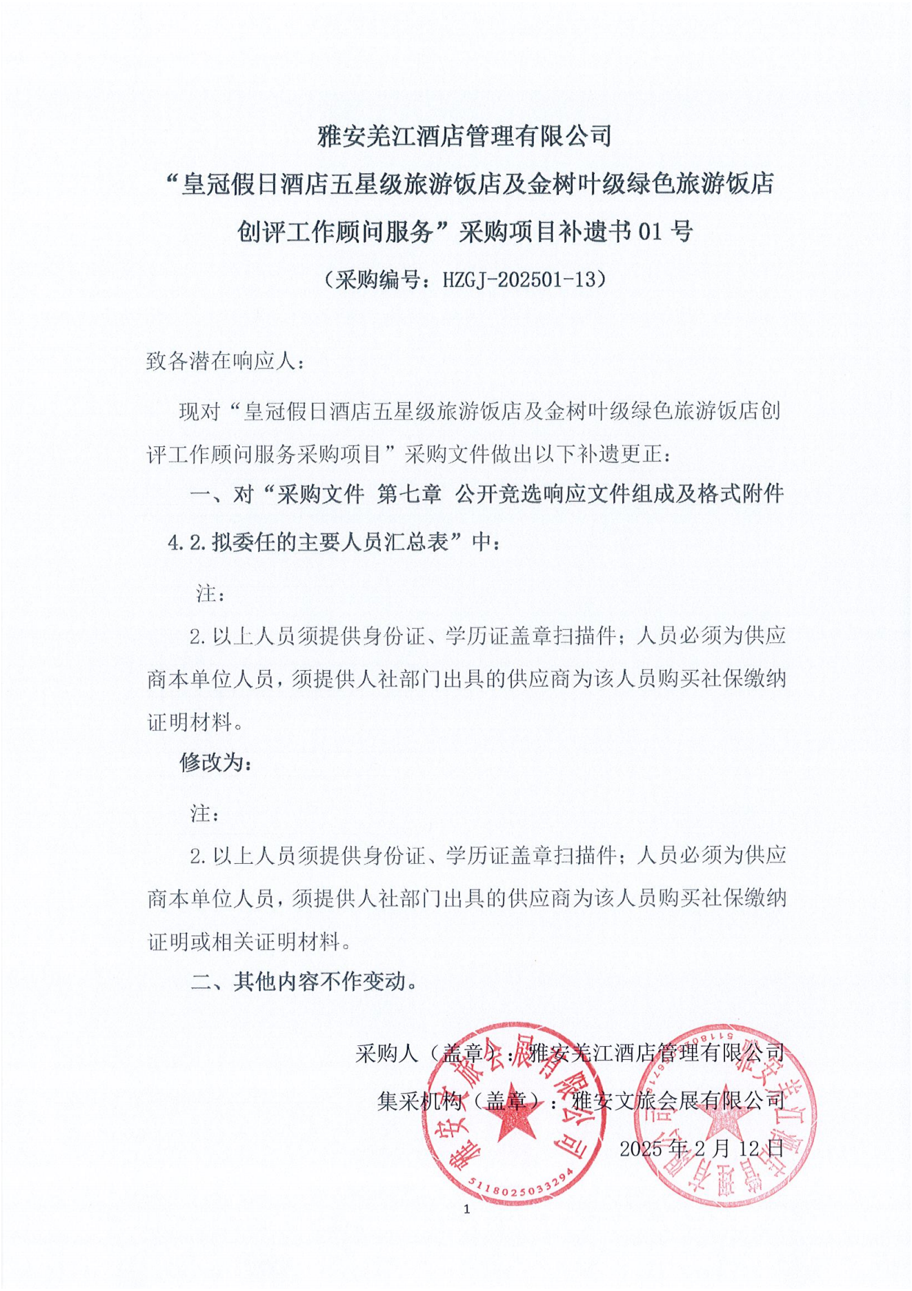 雅安羌江酒店管理有限公司 “皇冠假日酒店五星級旅游飯店及金樹葉級綠色旅游飯店創(chuàng)評工作顧問服務(wù)”采購項(xiàng)目補(bǔ)遺書01號
